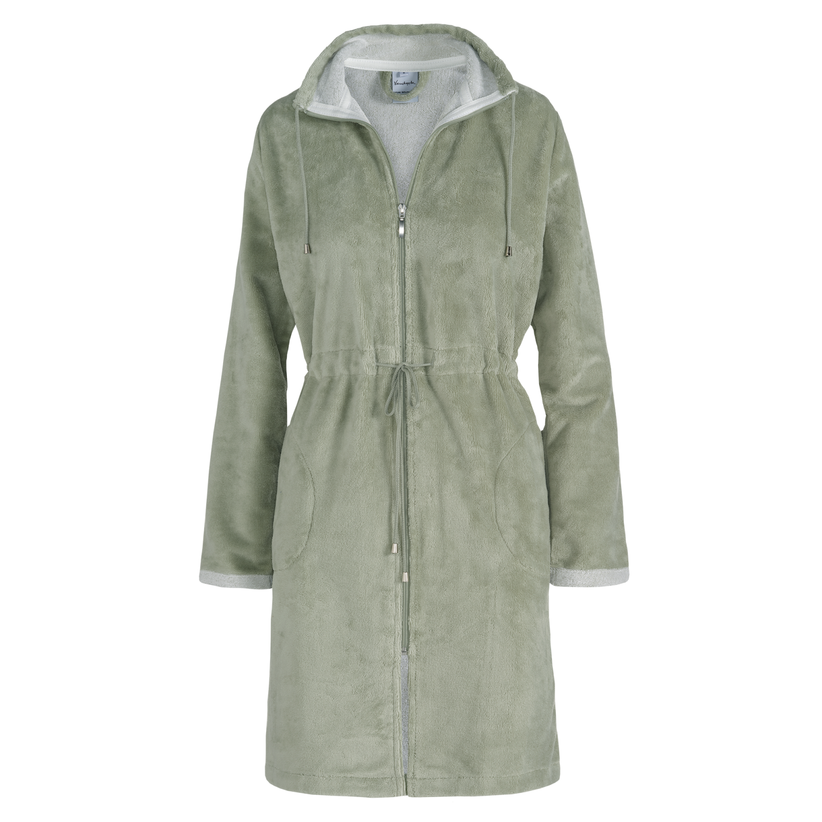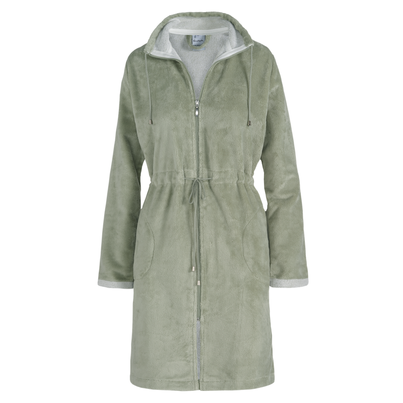 Badjas Chicago in de kleur salie is een korte damesbadjas van soepel velours met subtiele glans. De voering van bamboe en katoen voelt zacht aan en helpt bij het reguleren van temperatuur en vocht. Dankzij de ritssluiting en het taillekoord sluit de badjas mooi aan en biedt hij comfort tijdens je ochtendroutine of een ontspannen moment thuis.