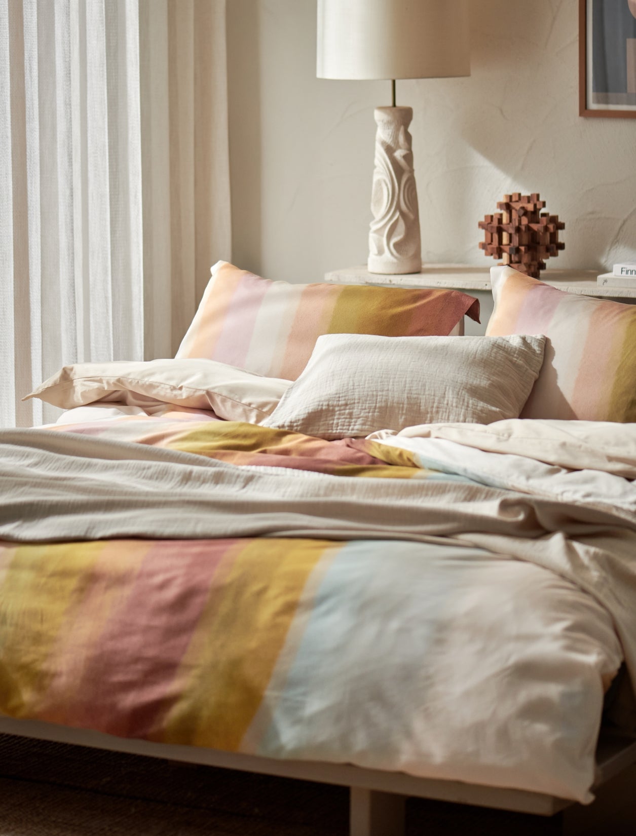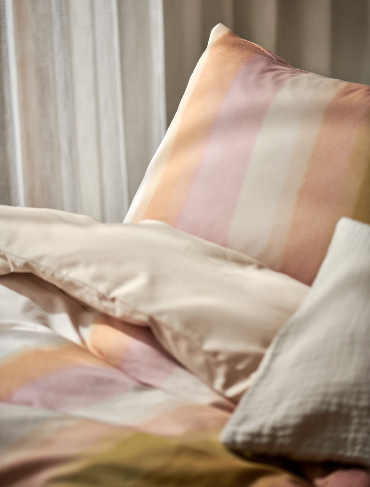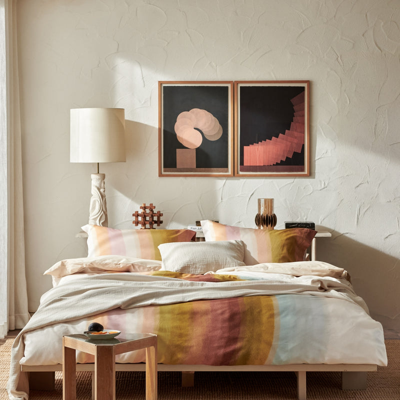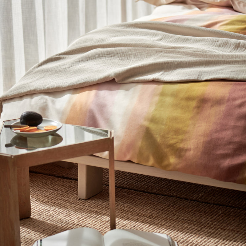 Colorwave XL dekbedovertrekset in multi toont golvende geometrische vormen in pastels met warm bruin en olijfgroen. De waterverfstructuur verzacht het dessin en geeft een rustige uitstraling. De set is gemaakt van 100% katoensatijn met een threadcount van 200. Katoensatijn voelt soepel en luxueus aan en ademt goed tijdens het slapen. De achterkant is uni in een cream tan kleur voor een rustig beeld bij omslaan. Het natuurlijke materiaal en de effen achterzijde geven afwisseling tussen dessin en uni. De maat 260x240 past royaal op een extra groot bed.
