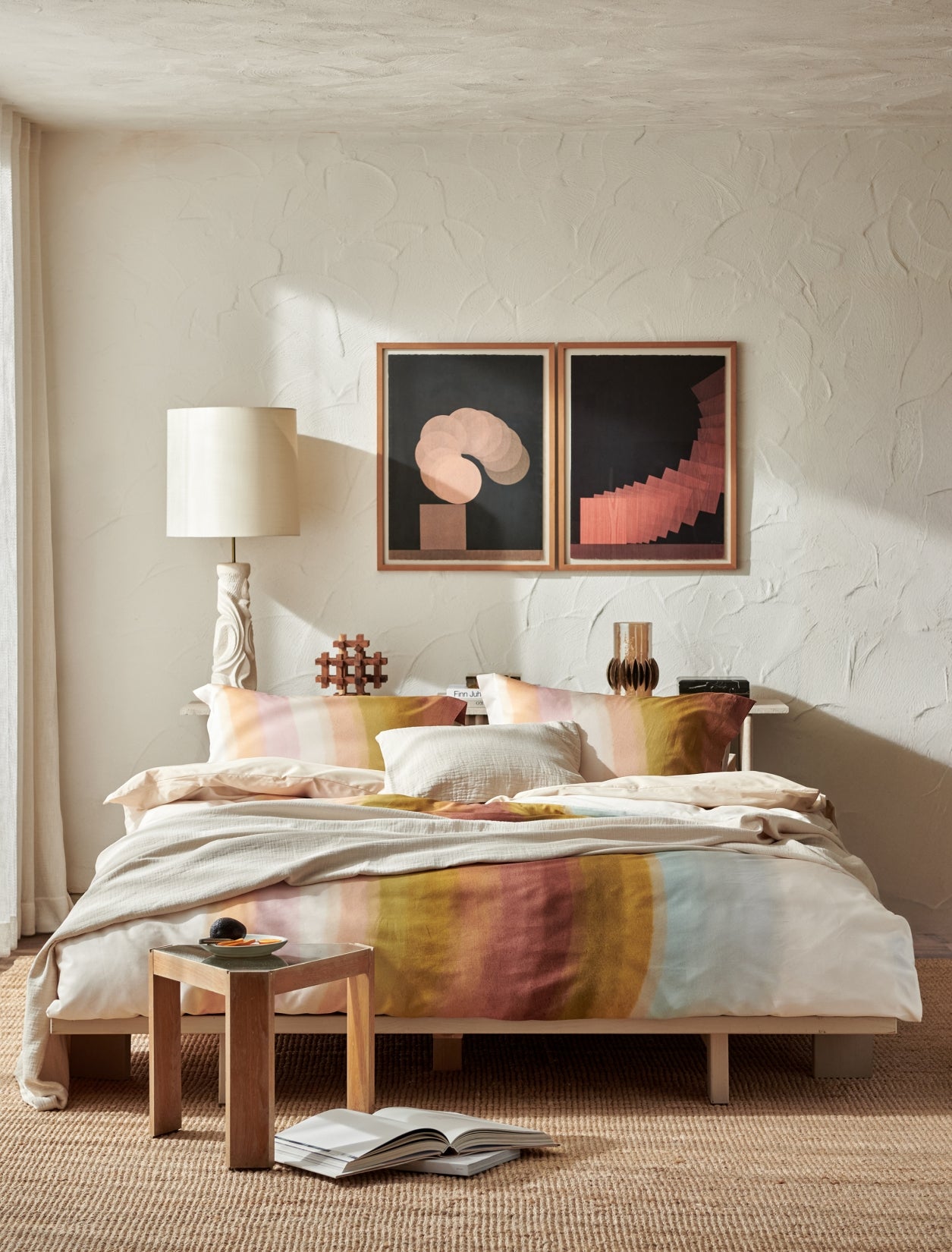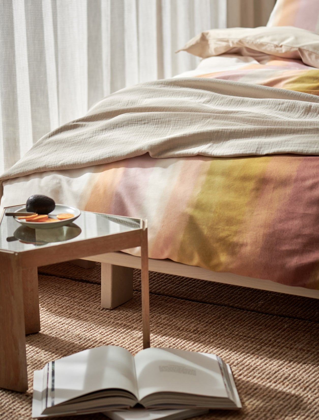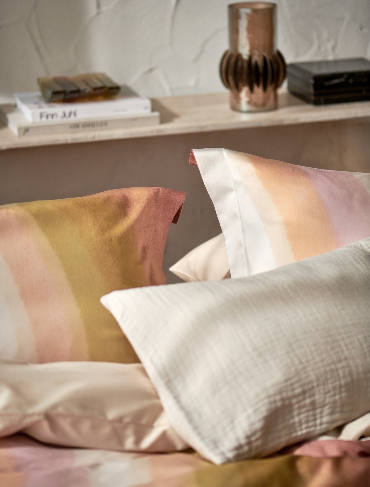 Colorwave XL dekbedovertrekset in multi toont golvende geometrische vormen in pastels met warm bruin en olijfgroen. De waterverfstructuur verzacht het dessin en geeft een rustige uitstraling. De set is gemaakt van 100% katoensatijn met een threadcount van 200. Katoensatijn voelt soepel en luxueus aan en ademt goed tijdens het slapen. De achterkant is uni in een cream tan kleur voor een rustig beeld bij omslaan. Het natuurlijke materiaal en de effen achterzijde geven afwisseling tussen dessin en uni. De maat 260x240 past royaal op een extra groot bed.