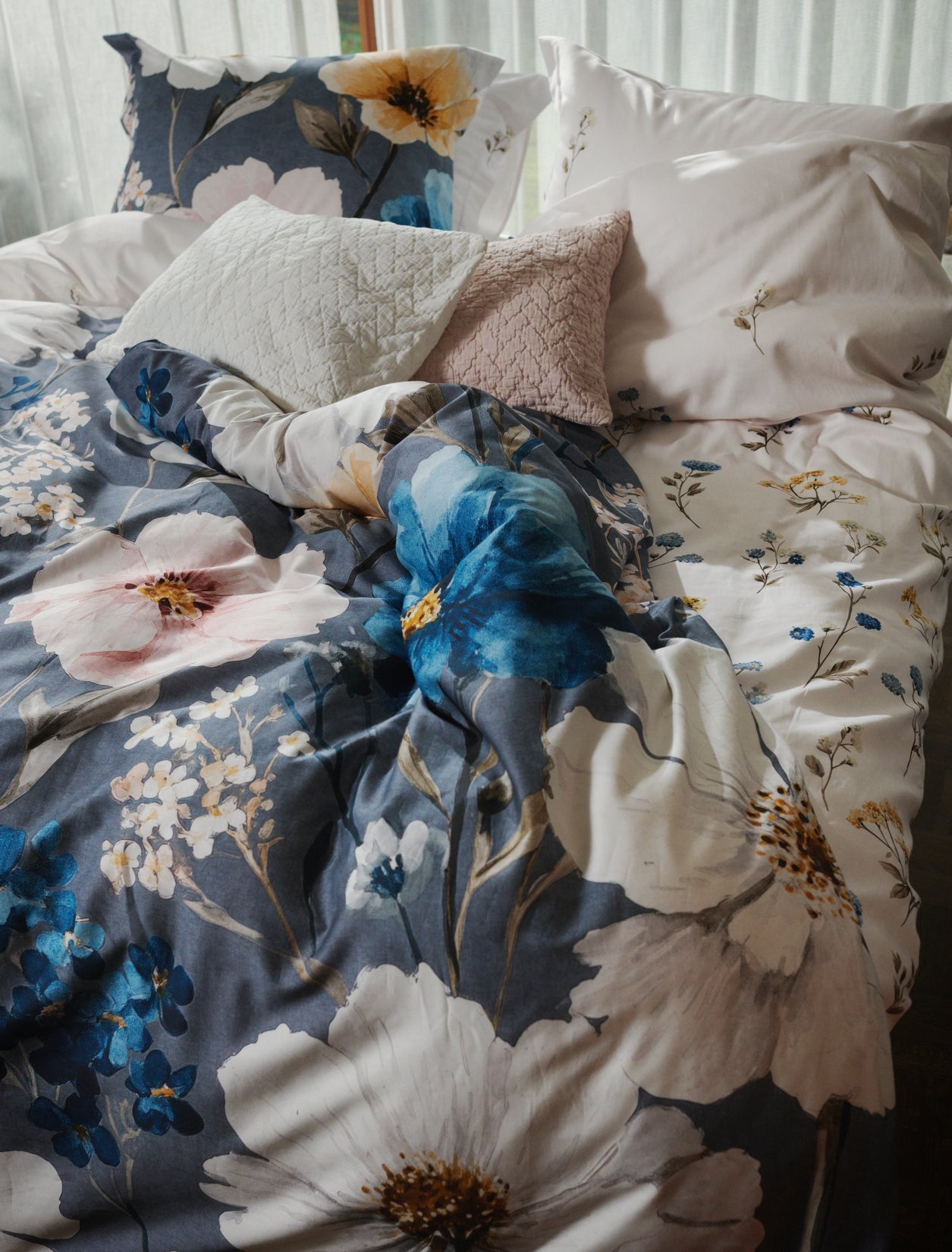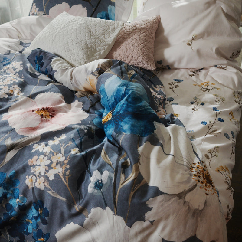 Niva XL dekbedovertrekset in stone is gemaakt van 100% katoensatijn met een threadcount van 210. Het dessin toont bloemen in blauw en gele kleuren met takjes op een off white achtergrond. De achterkant is uni in off white en geeft een rustig beeld wanneer het dekbed wordt omgeslagen. Katoensatijn voelt soepel en luxueus aan en is een natuurlijk materiaal dat prettig ademt. De XL maat van 260x240 zorgt voor een royale pasvorm op grotere bedden.