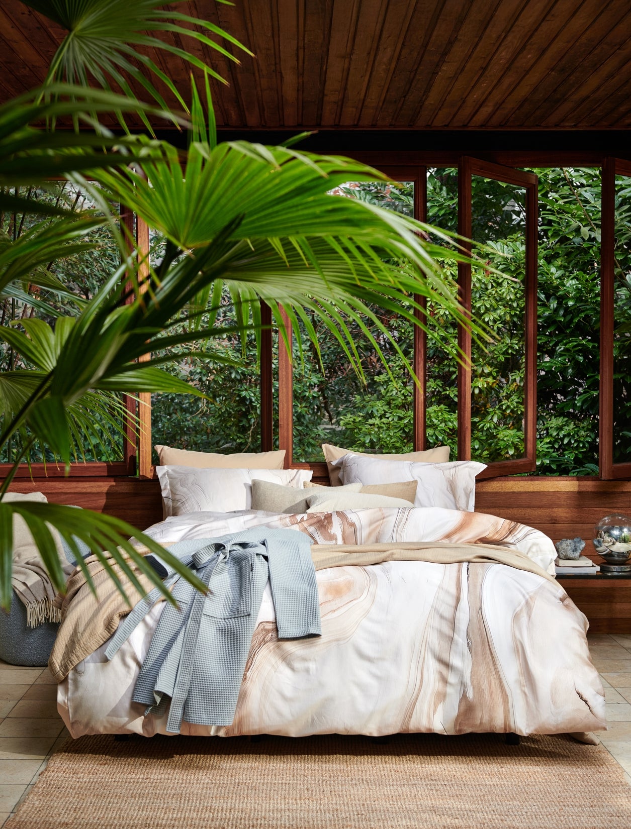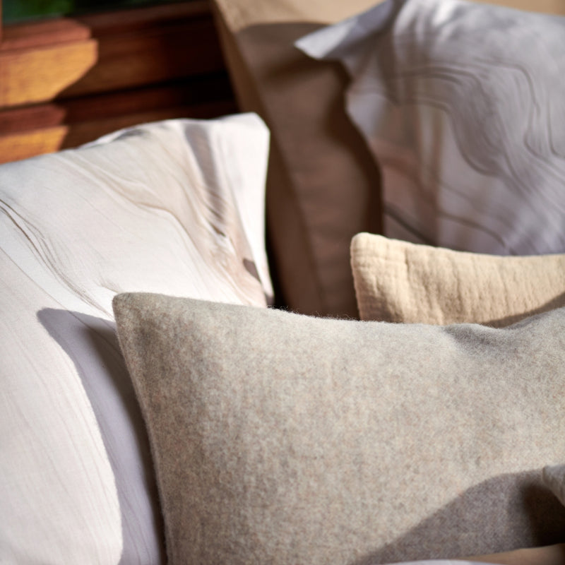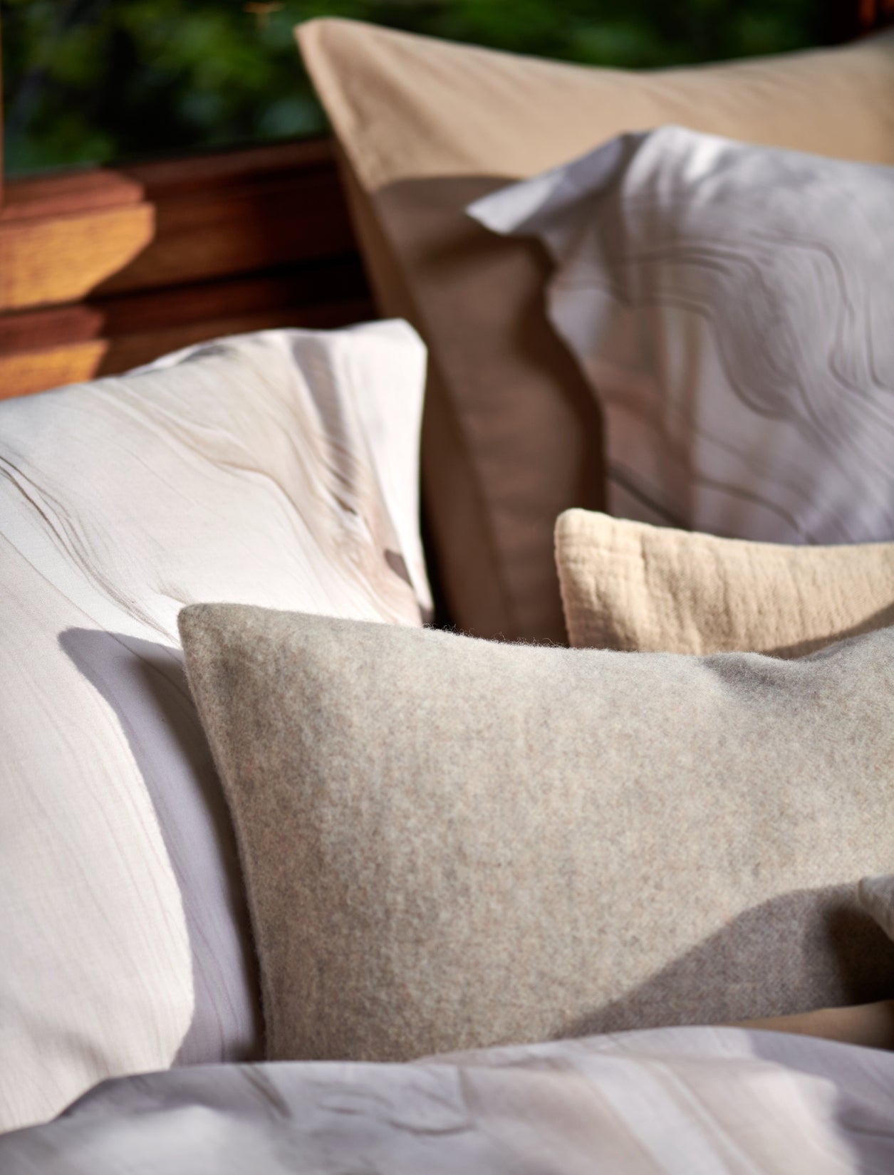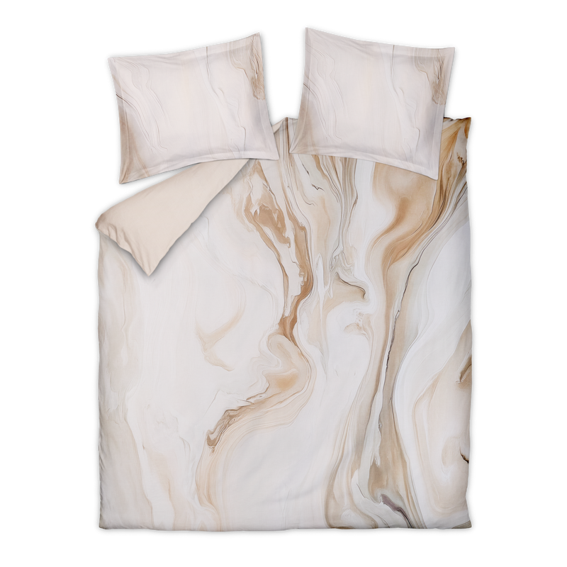 Sandstone dekbedovertrekset in sand is gemaakt van 100% katoensatijn met een 200 threadcount. De stof voelt soepel en luxueus aan en heeft een subtiele glans door de fijne weving. Het dessin met organische lijnen in zandkleuren geeft het geheel een rustige uitstraling. De achterzijde is uni en crème kleurig.
