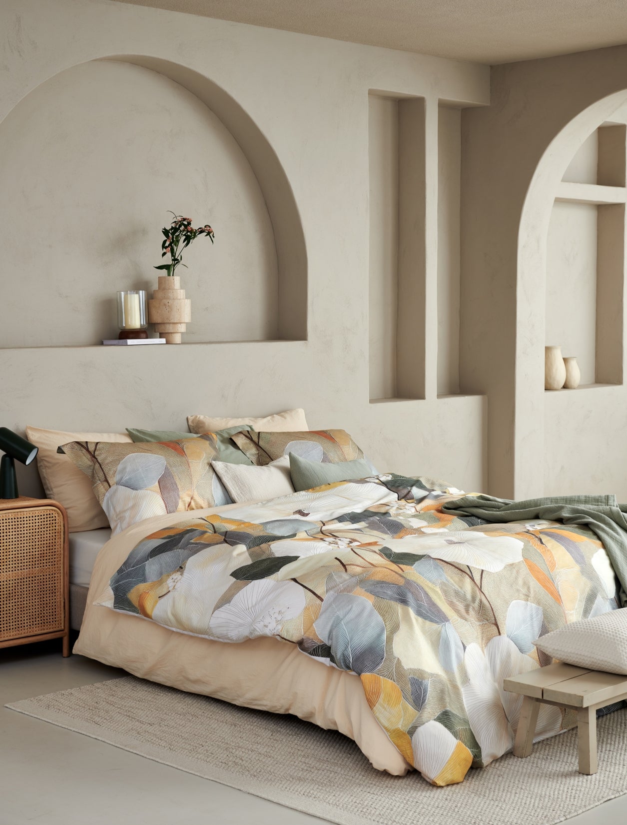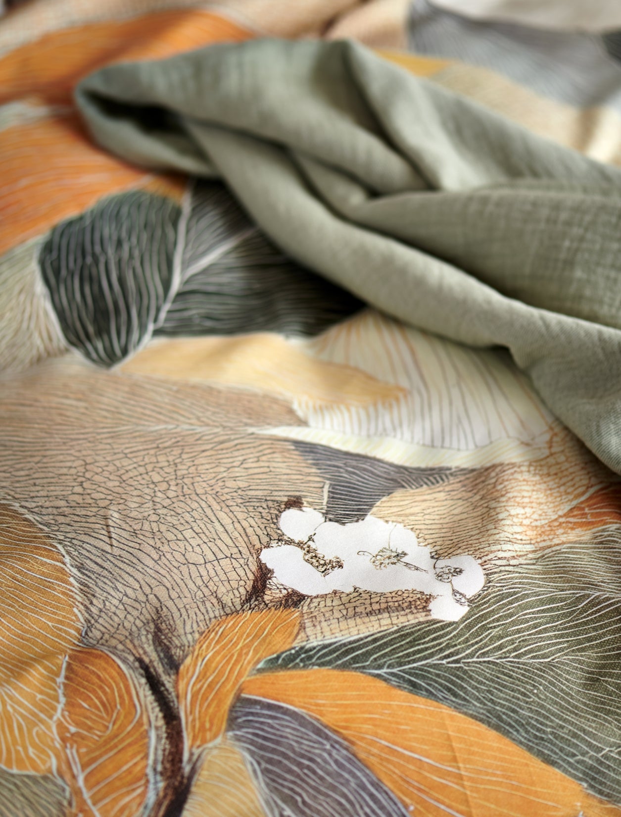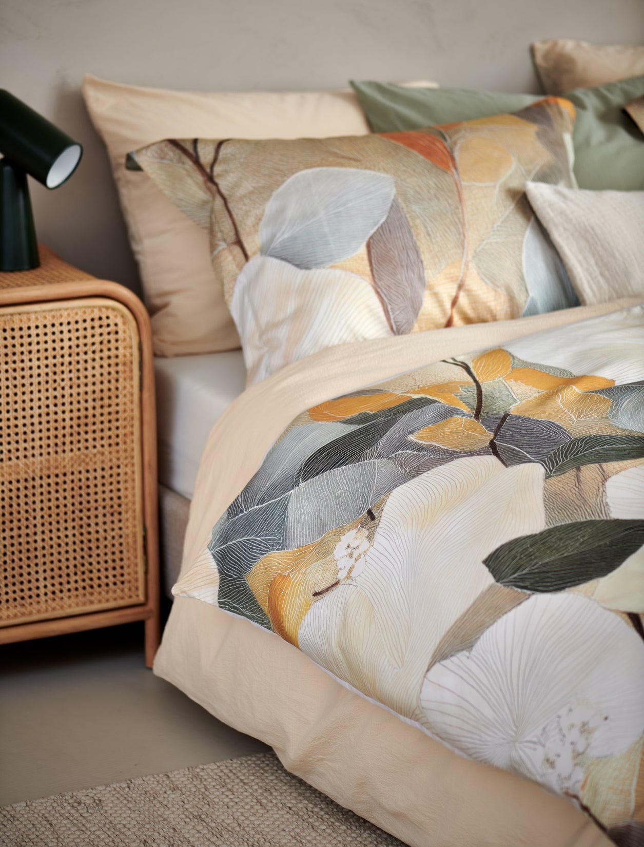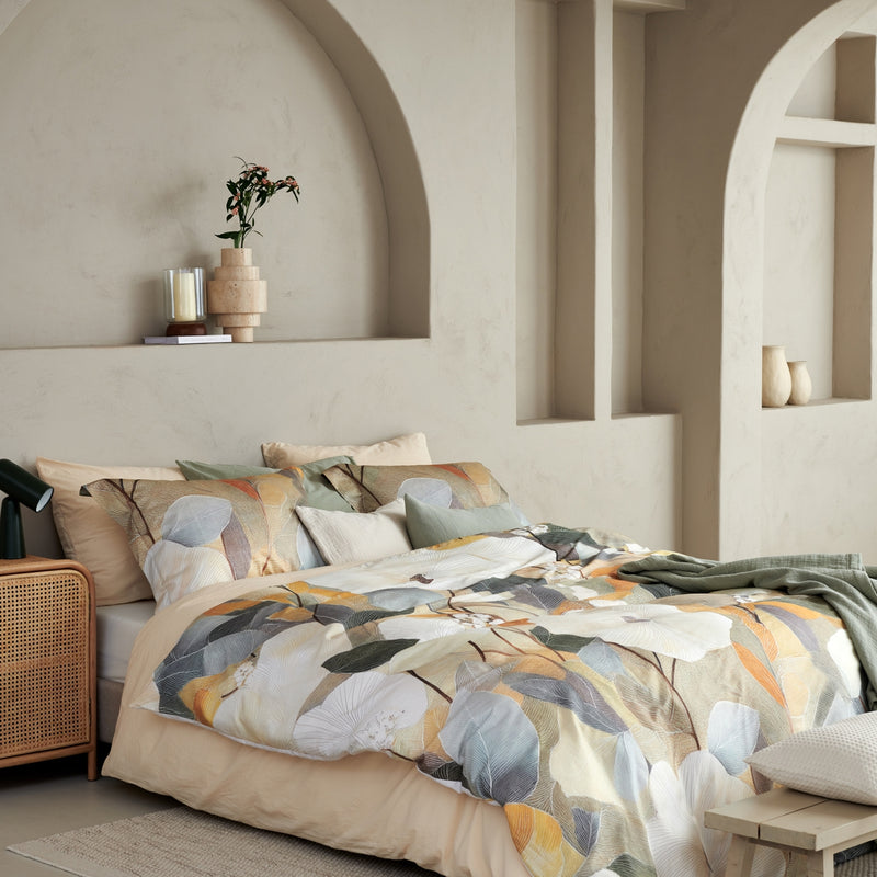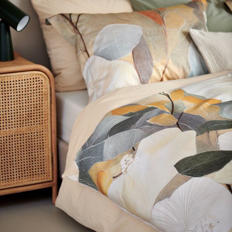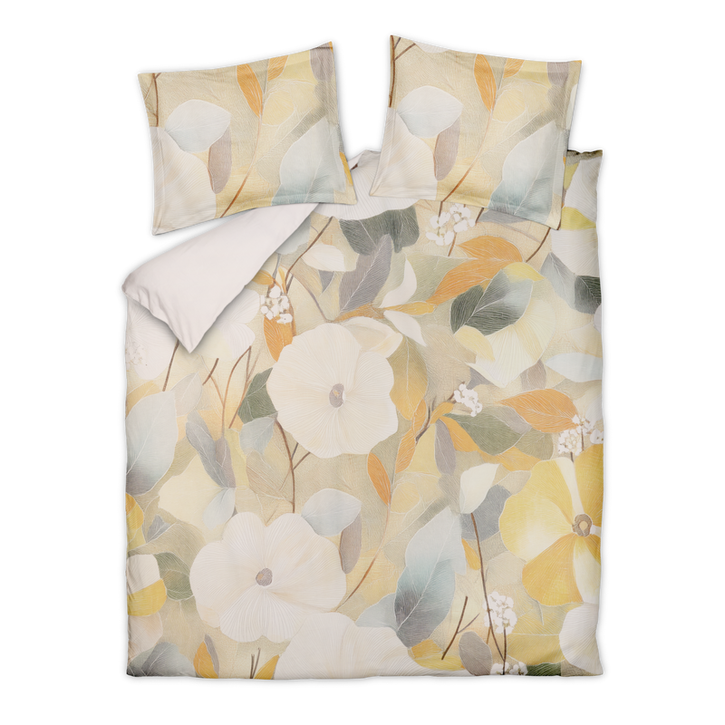 De Senna dekbedovertrekset in multi is gemaakt van 100% katoensatijn met een 200 threadcount en voelt soepel en luxueus aan. De fijne satijnweving geeft de stof een glad oppervlak met een subtiele glans en ademt goed. Het dessin toont abstracte bloemen en bladeren in geel tinten. De achterzijde is uni in cream tan kleur en geeft rust aan het geheel. Dankzij het natuurlijke materiaal geniet je van comfortabel slaapcomfort met een verfijnde uitstraling.