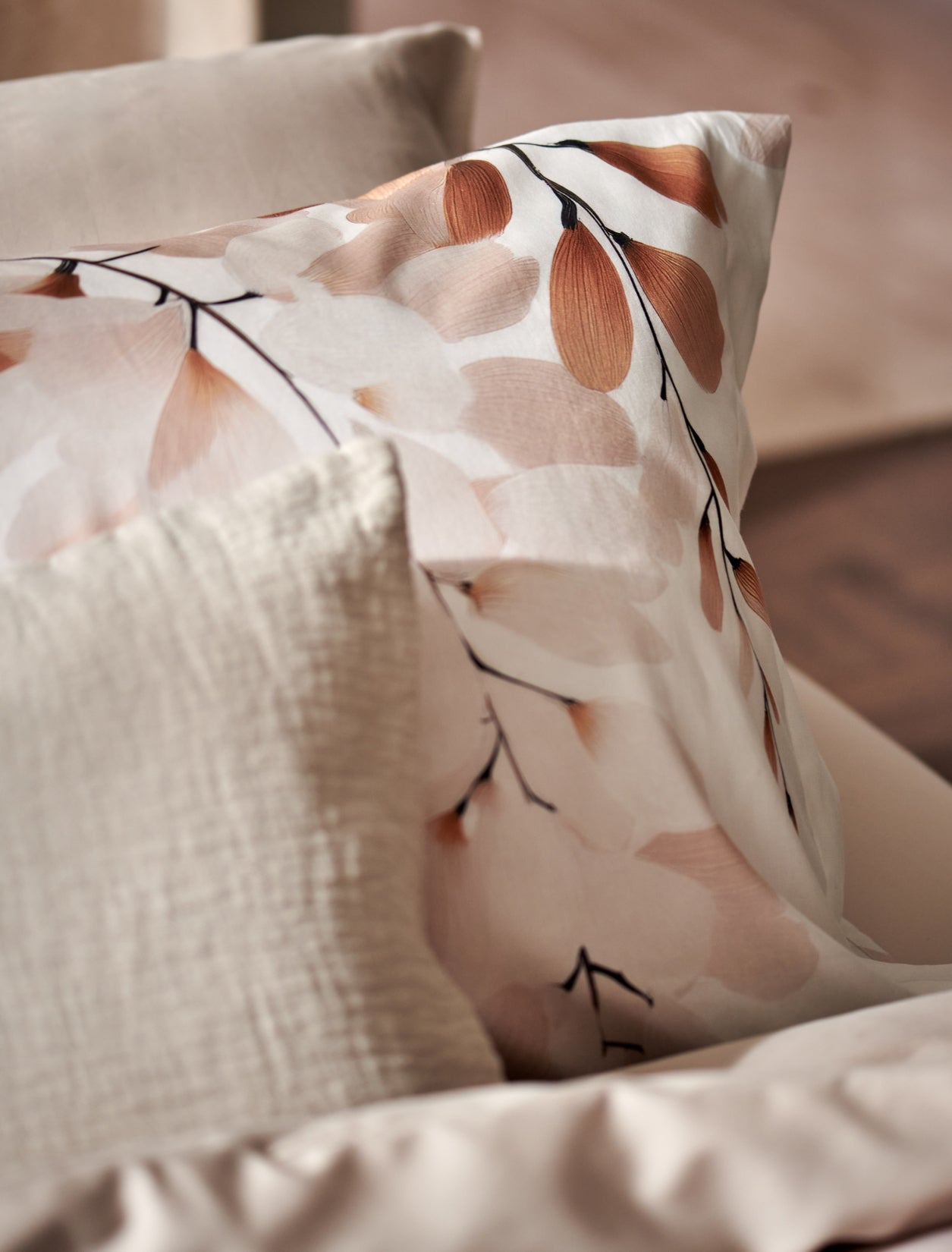 Twigform XL dekbedovertrekset in offwhite is gemaakt van 100% katoensatijn met een 200 threadcount. De fijne weving geeft een glad oppervlak met subtiele glans en voelt soepel en luxueus aan. Het dessin toont omlaag hangende bladeren in zachte aardse tinten tegen een offwhite ondergrond. De achterzijde heeft een uni off white kleur. Deze XL set heeft de maat 260x240.
