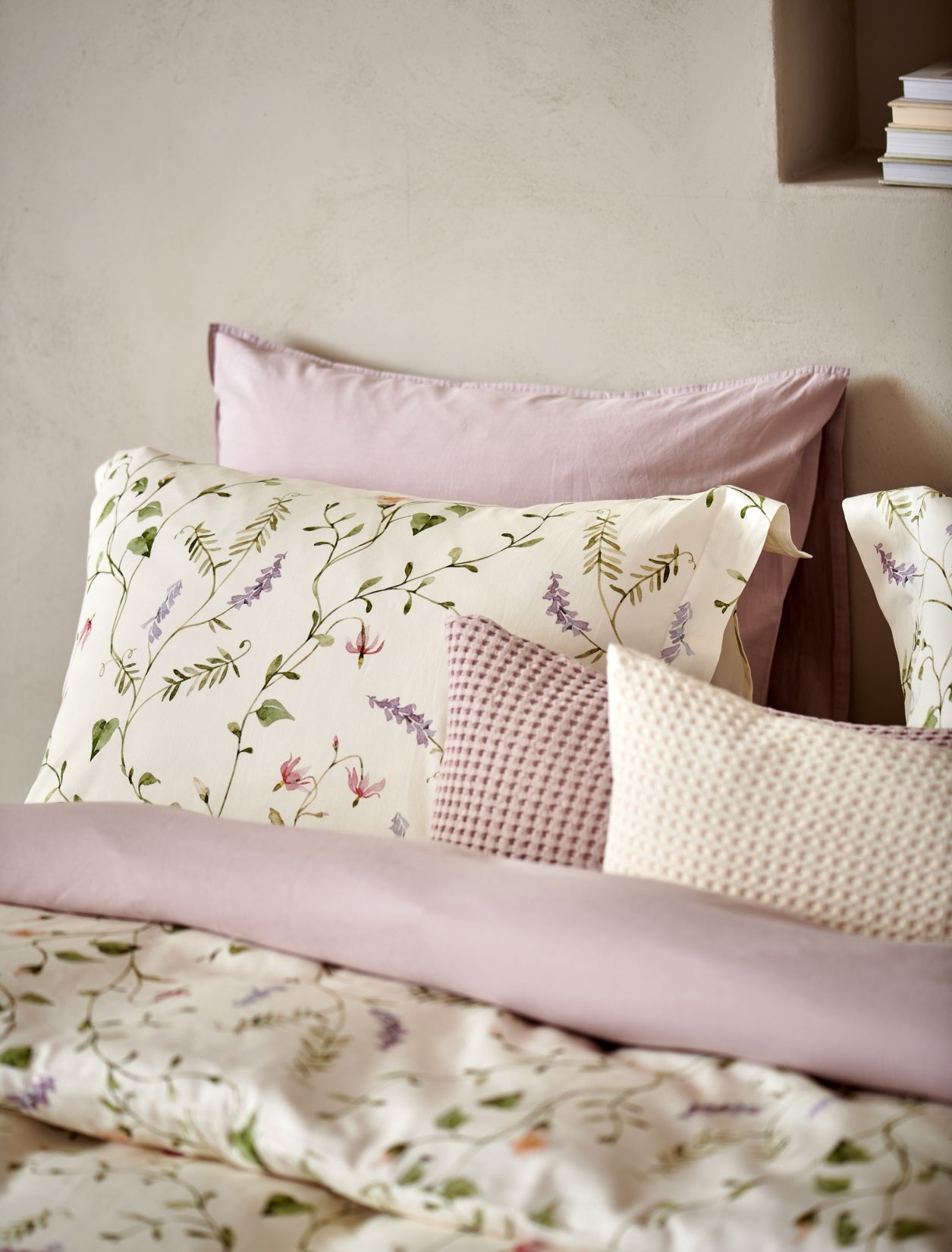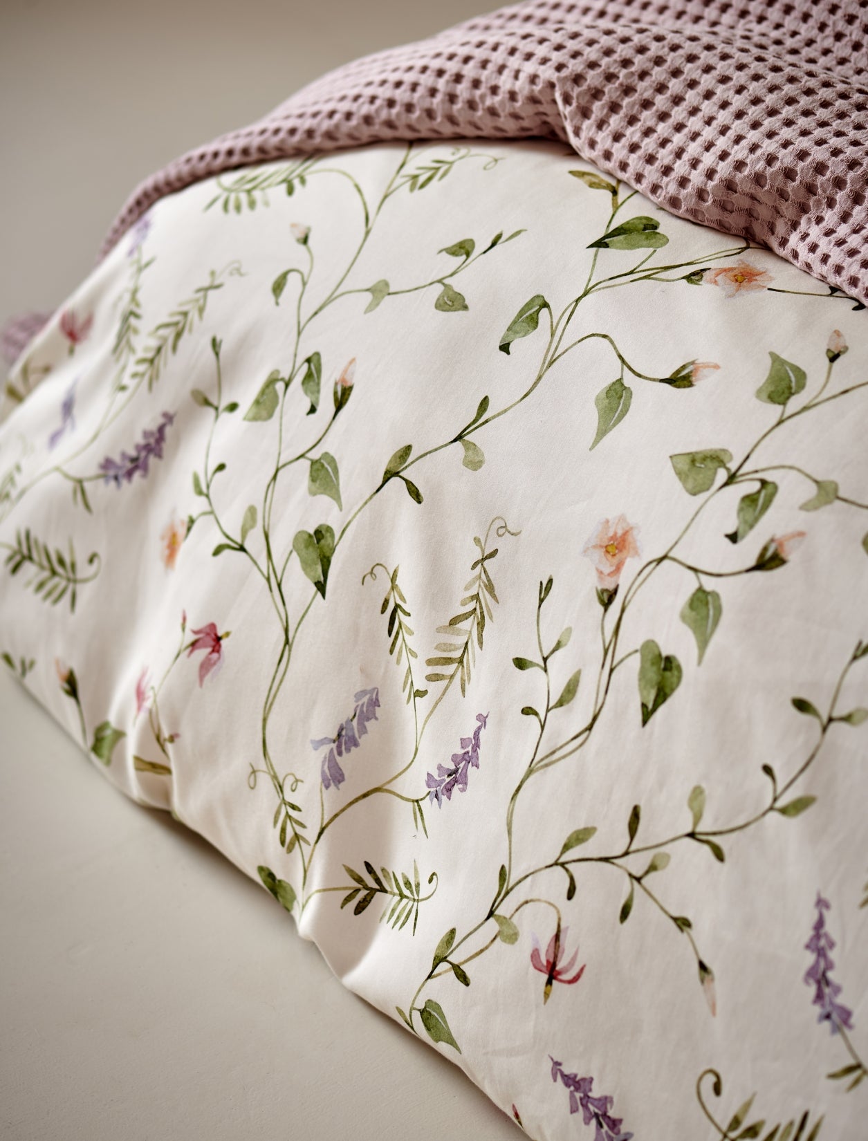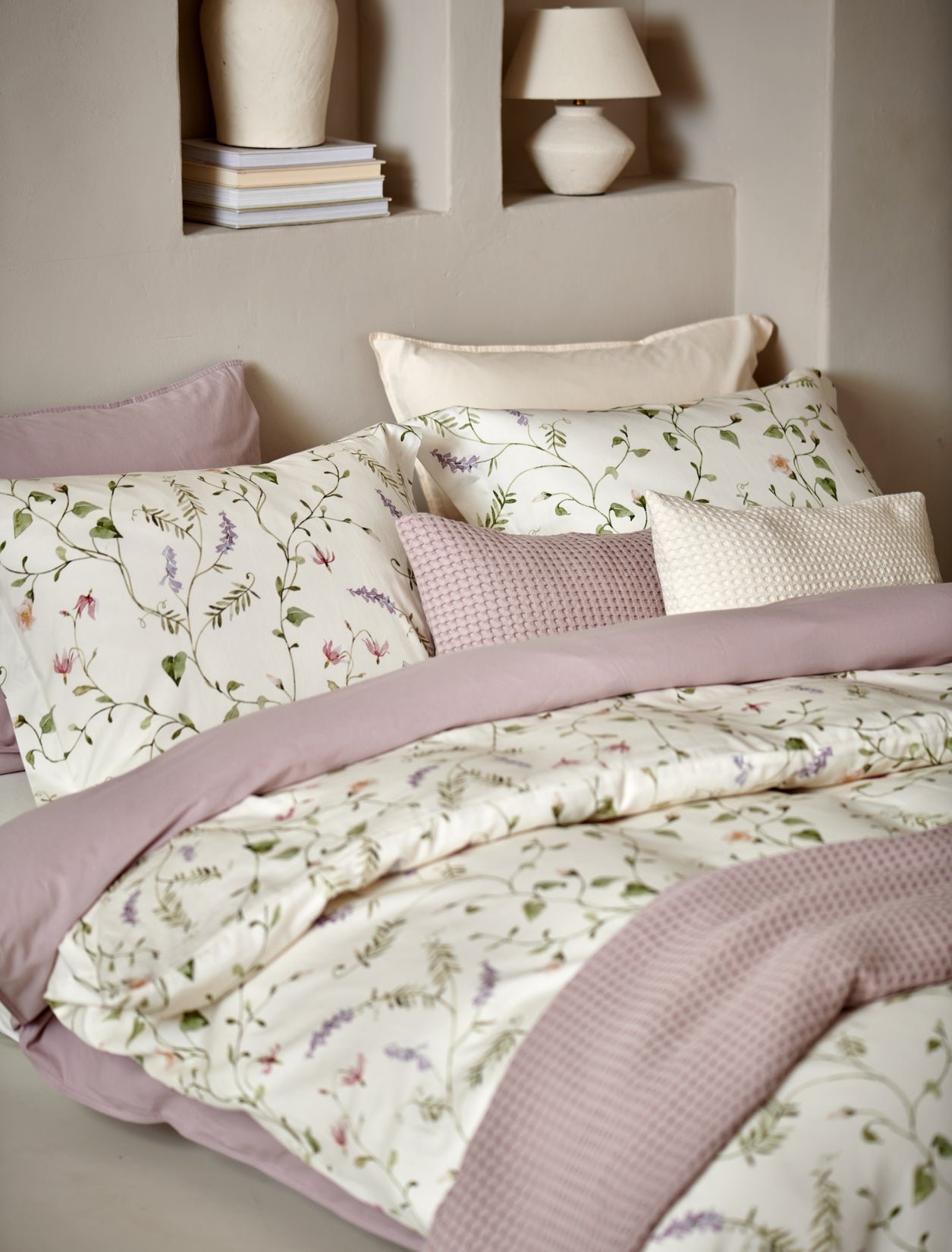 Virella dekbedovertrekset in cream tan is gemaakt van 100% katoensatijn met een 210 threadcount. De soepele luxueuze stof voelt natuurlijk aan en heeft een subtiele glans. Het dessin toont romantische bloemen en blaadjes in waterverf op een cream ondergrond. De achterzijde is effen en heeft een uni achterkant in zachte cream tan kleur daardoor oogt het geheel rustig.